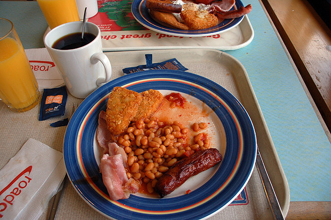| Maandag:Lekker geslapen en rustig opgestaan. Nadat we onze spullen weer in de auto gelegd hadden konden we gaan eten: op de valreep nog een echt Engels ontbijt! |