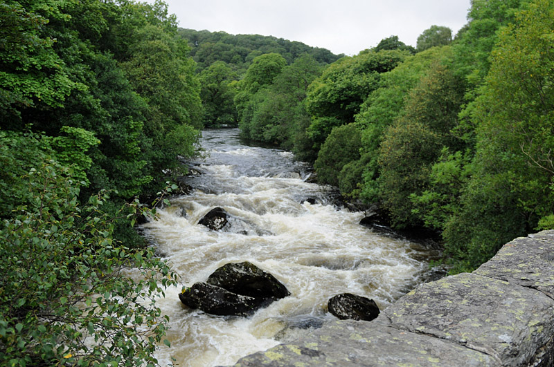 Dan gaat het pad via velden en een prachtig bospaadje richting de A5. Hier lopen we langs de weg en horen het gebulder van de Afon Llugwy al. Op de Pont-Cyfyng is het woeste water zichtbaar.